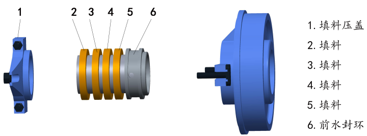 4. 最后将填料压盖安装,螺栓不要拧太紧,开泵后根据填料处滴水量,再调整填料压盖的松紧度。